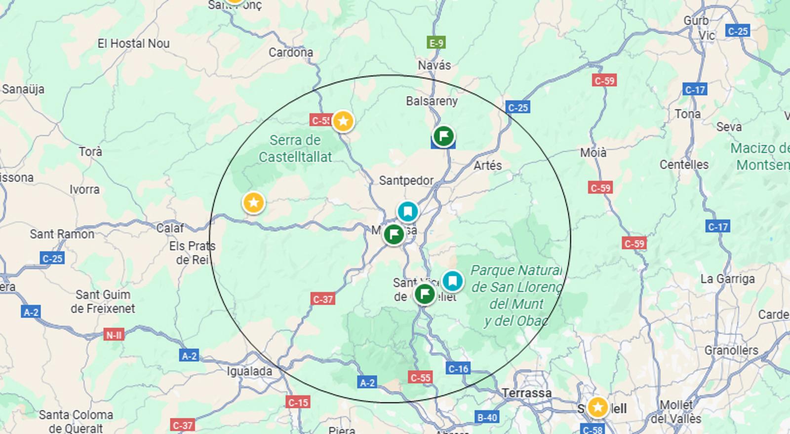 - Comarca del Bages: Sant Joan de Vilatorrada, Santpedor, Súria, Navarcles, Sallent, Cardona, Artés, Avinyó, Callús, Balsareny.